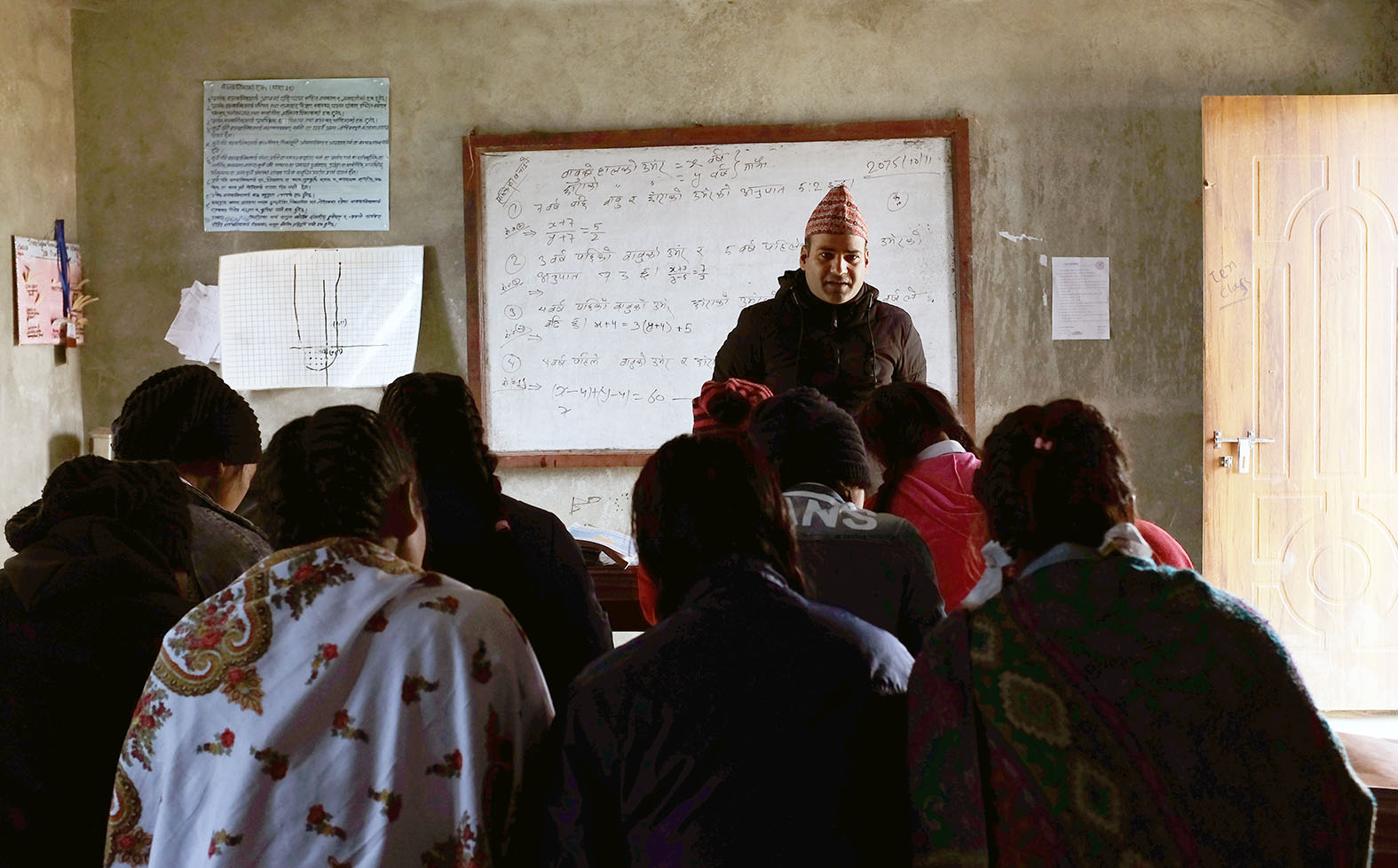 luokkahuoneen edessä opettaja seisoo valkotaulun edessä. 7 nuorta, joista monella on paksu huivi harteillaan, katsoo häntä kohti.