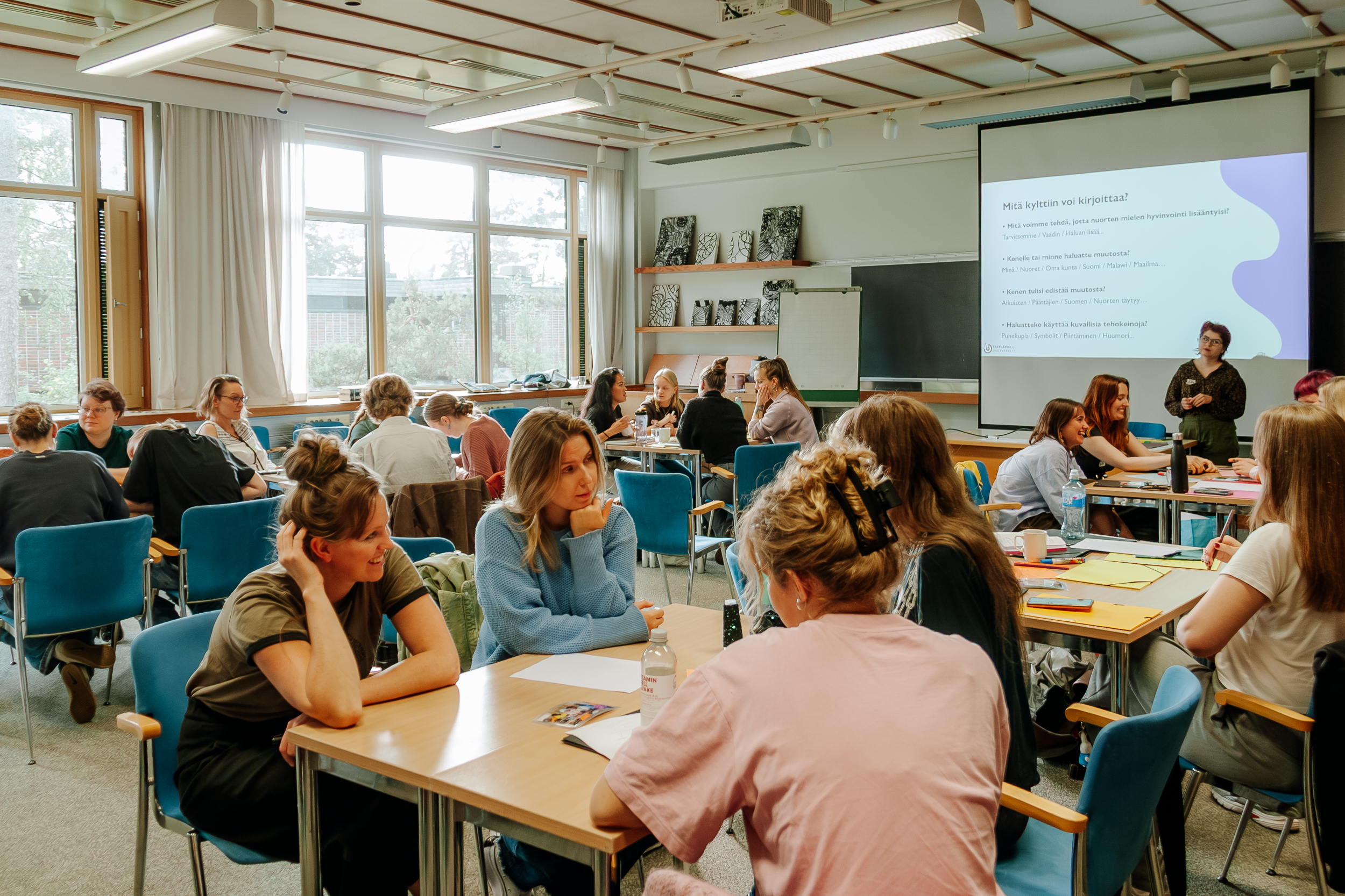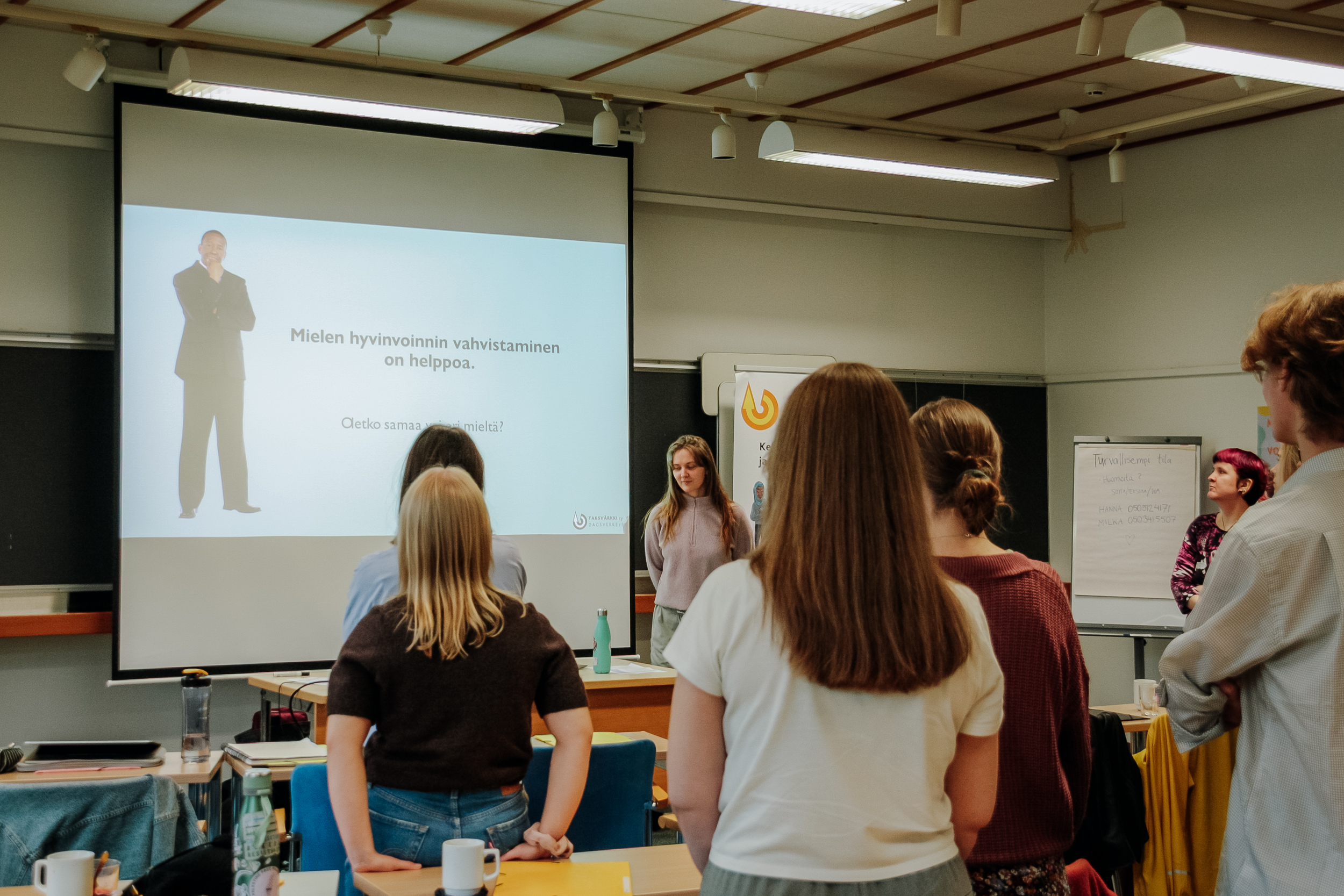 Kouluvierailijoiden salissa käytiin läpi tämän lukuvuoden Miten sä voit? -kampanjan työpajaa, jota vapaaehtoiset pääsevät itse koulutuksen jälkeen ohjaamaan kouluihin eri puolilla Suomea.
